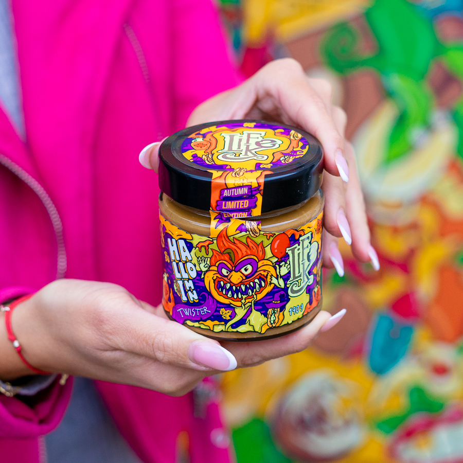 Základ tvorí kombinácia arašidov a pekanových orechov 🥜, ktoré sme doplnili o tekvicový olej a javorový sirup 👌 A pretože je potrebné si sychravé jesenné dni osladiť, použili sme aj my na jemné dosladenie kokosového cukru 🍬 A čerešničkou na torte je kombinácia vybraného prémiového korenia, za chladných dní zahreje ako huňaté ponožky 🧦 Ako NOVINKA pre tento rok je, že nájdeš v kréme kúsočky arašidových orechov - ktoré krásne chrumknú 💥